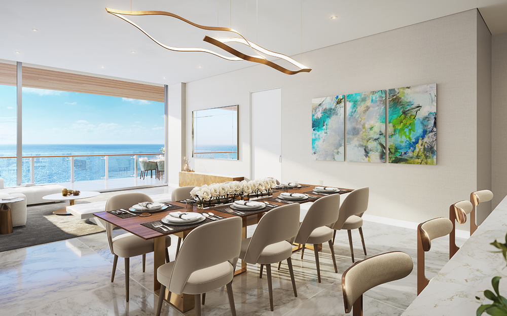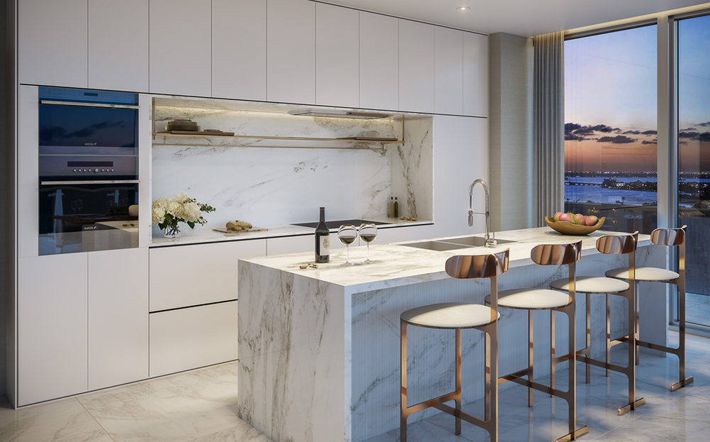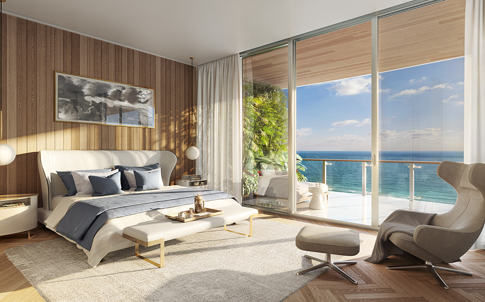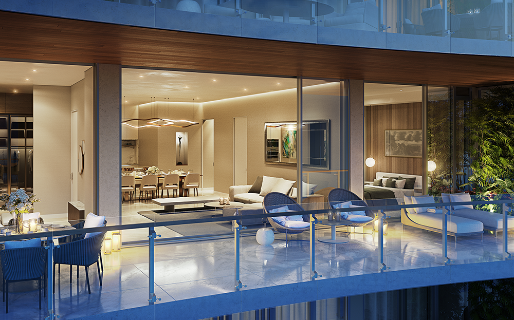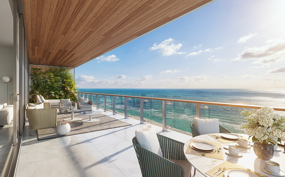 El lujo orgánico frente al océano abunda en las 81 residencias, cada una de ellas con su amplio balcón con vistas del océano o la ciudad, ventanas de piso a techo que iluminan amplias salas de estar y espléndidos dormitorios principales que se abren a discretos balcones. Las cocinas de Poliform, hermosamente distribuidas, animan a familiares e invitados a reunirse en torno a la isla, mientras que los baños de los dormitorios principales, revestidos de piedra natural, sirven como retiro privado para parejas con sus bañeras flotantes y sus puertas corredizas de vidrio. Amplias terrazas con detalles que semejan textura de madera definirán a cada hogar de 57 Ocean. Como salas de estar al aire libre, estos balcones convidan a los invitados a sentarse para cenar o disfrutar de animadas reuniones estilo cóctel, o bien les permiten a los propietarios relajarse en paz mientras disfrutan la brisa del mar.