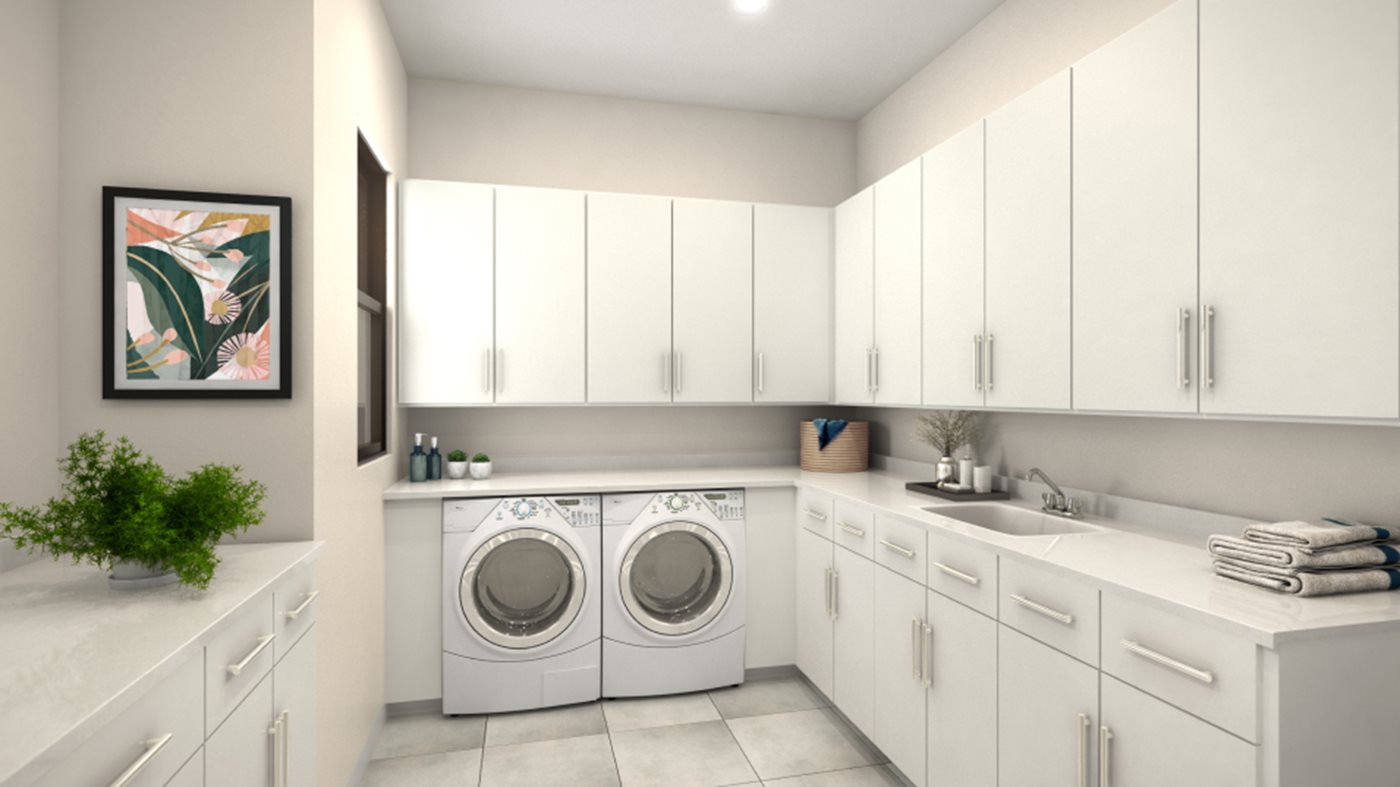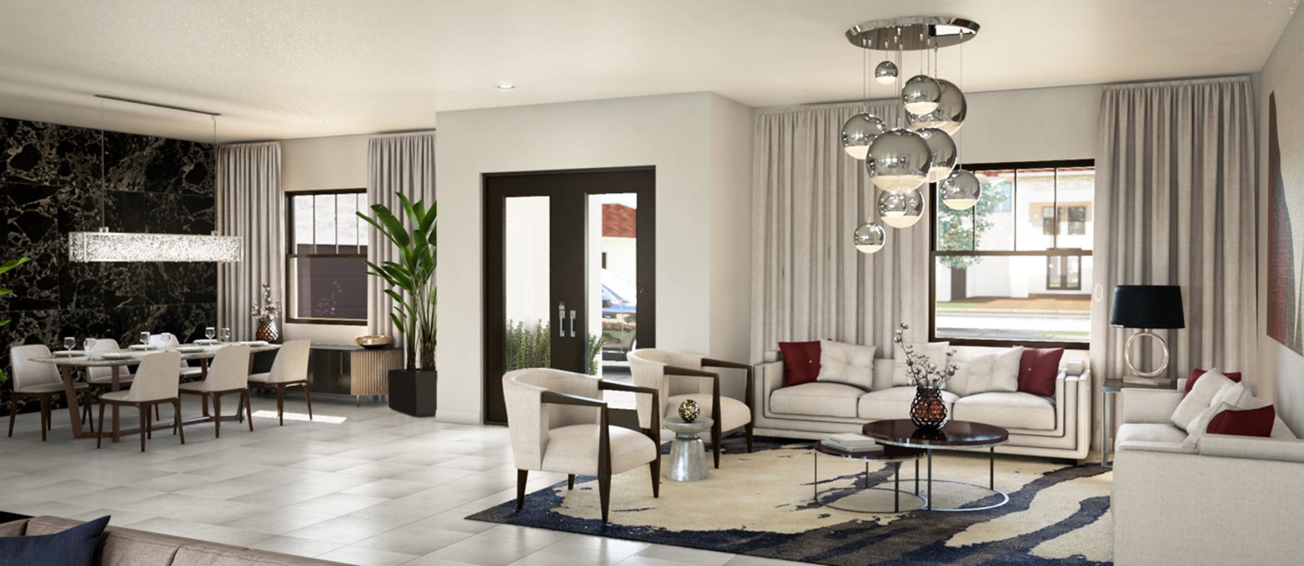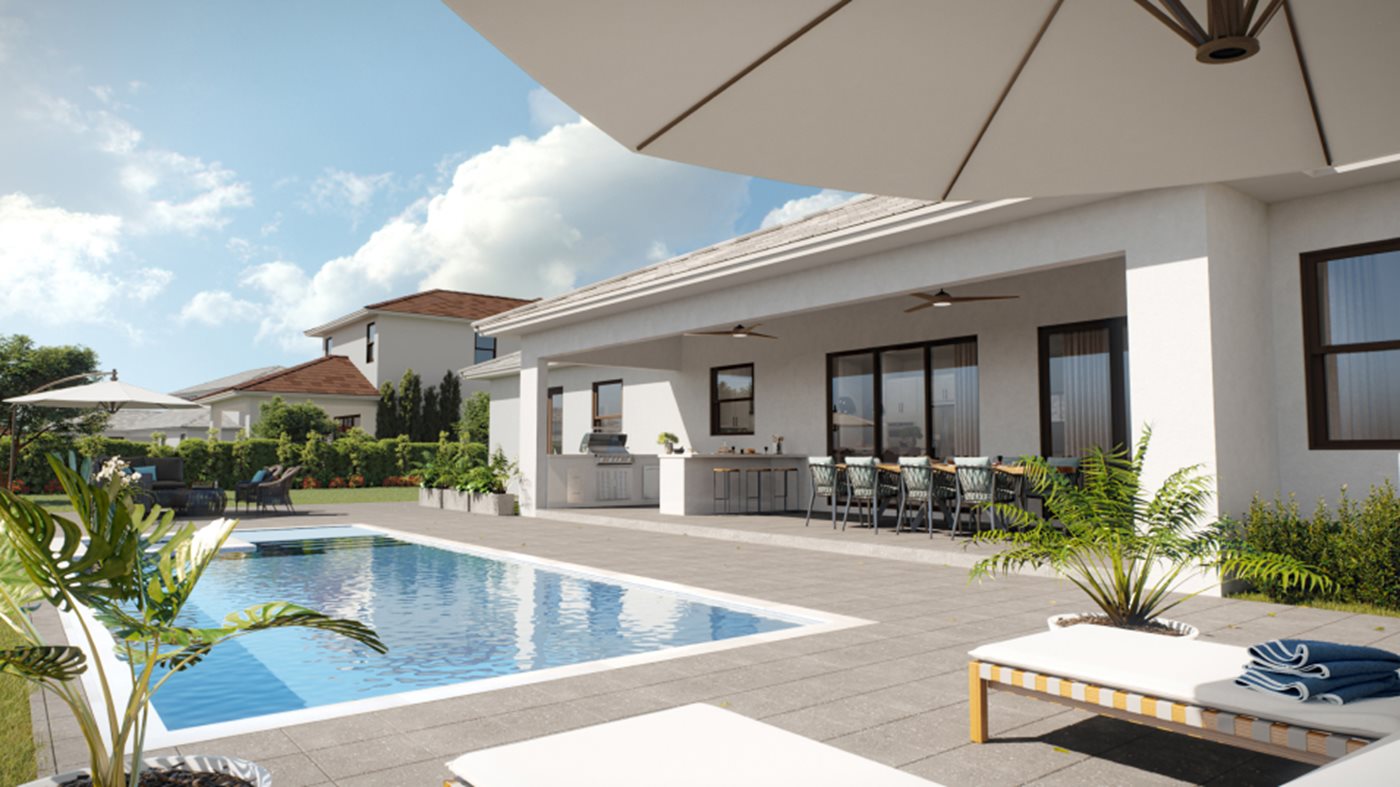 El plano de planta abierto compartido entre la sala de estar, la sala familiar, la cocina y el comedor es el corazón de esta casa de un solo piso, que conduce directamente al exterior a la terraza cubierta para una cómoda vida interior y exterior. La suite del propietario y el dormitorio 5 están situados en un extremo del espacio habitable, mientras que los tres dormitorios adicionales se encuentran en el extremo opuesto de la casa.